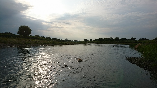 愛犬を連れて川へ。どこからか大きなボールをくわえてきて、朝陽の隣を泳いでいます。この後、大粒の雨が降ってきて、しっかり濡れて、開き直って一緒に川に入って遊びました。朝から全開です。