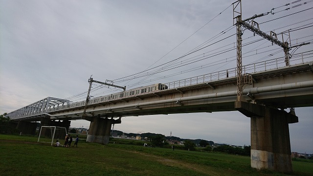 京王多摩川の鉄橋。電車は京王相模原線登り、速さから多分特急(準特急)かと。
