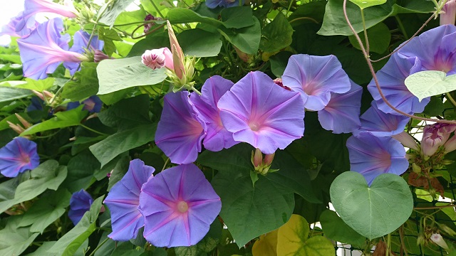 ノアサガオ(琉球朝顔)というそうです。いつも行くプールの塀に咲いています。