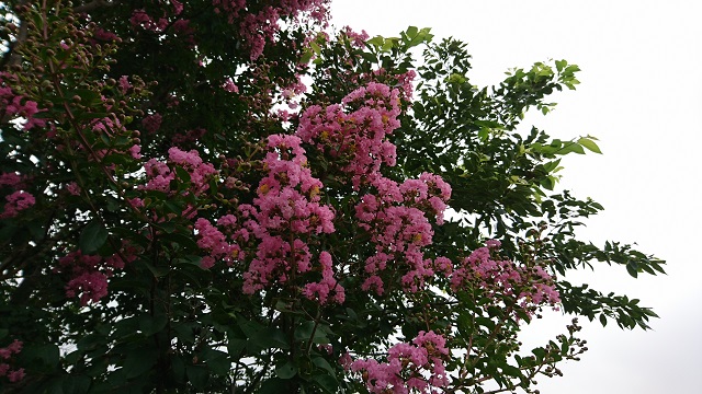 土手の上からサルスベリの木だと思って駆け下りて行ったのですが、近くで見ると何か違う感じ。幹がツルツルしてないし白くない。でも、落ち着いた桃色の花が曇り空によく似合っていて綺麗。。写真が若干ぶれているのは、足元の草の朝露がすごくて、腿上げで走って行って息が切れていたせい、です。