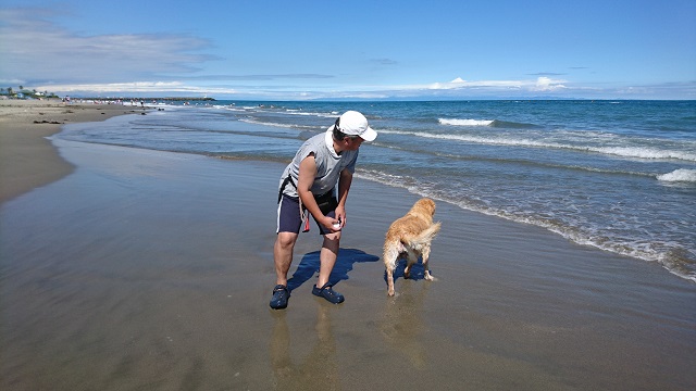 牧之原市相良の海岸です。以前にここでサーフィンを教えて貰って、今もshopに板を置かせて貰っています。犬も海が大好きで目一杯遊んできました。小山が投げたボールを波を乗り越えて取りにいきます。この時の様子はブログに書かせて貰おうと思っているので、また良かったら覗いてみて下さい。にしても、このフタリ、何か体型が、、足の開き方とかも必然的に似てきて、、。
