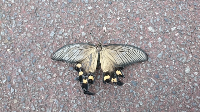 アスファルトの上に羽を羽を拡げたまま動かない。近くにスズメ。一度通り過ぎたのですが、どうしても気になって、、。戻って覗き込むと、触覚が少し動いてる。でもアスファルトに突っ伏したまま。「どうした? スズメにやられたのか? つらいことでもあったのか?」と、人指し指を出すと、シッカとつかまってきました。近くの尖っていない草の所にそっと置いてきて、後から写真を見ると、右下の部分が少し欠けているような、、。元気でいるといいなあ。