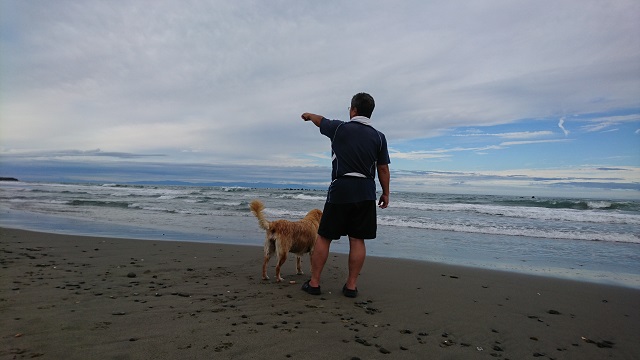 小山が左手を上げて何か指さしています。でも愛犬なずなは別の方向を見ているし、、。先程小山に何を指さしていたのか聞いてみましたが、「?...」との事。で、余計なお世話ですが想像してみました。普通に考えて「なずな~、ボールはあっちだあ」でもボールは無かったし、「なずな~、日本一の富士山はあの雲の下だあ」なんて事も無理があるし、、「なずなよ~、大志を抱けえ」なんて事はもっと無理があるような、、。風向きでも知りたかったのかなあ。。