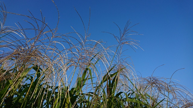 昨日、赤い実を撮っていたら横に生えていました。青空をバックにこれまた絵になっています。外来種かなあと思って見ていたら、ラジオ体操帰りの知人が「ススキだよ~」と言ってきたので、素直で純粋な私は 信じることにしました。ススキでいいです。 ところで、ススキは秋の七草のひとつだと言うことをご存知でしょうか。そうです。「尾花」です。動物のシッポが垂れ下がった感じに似ているからとか、、。写真、似てない。真上向いてるし。 やっぱり調べます。。