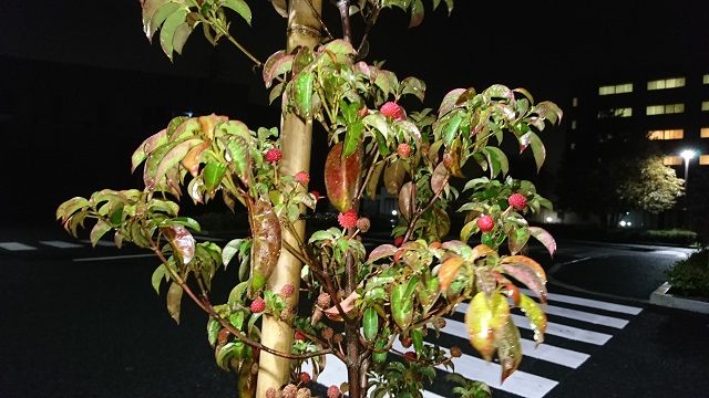 先週は紅葉が足元で出迎えてくれたような、、。二週続けての暴風雨で、車はピカピカです。はい、前向きです。さて、この病院はまだ新しい病院で、植樹されているものも若木が多いのですが、このヤマボウシも若い若い。幹が指ほどの太さで、横の支柱の竹がとてもたくましく見えます。実際、強い風の中、竹に必死に寄り掛かっているようでした。病院の明かりも嬉しくて思わず一枚。写真を撮っている時、小山は傘を差しながら、両手にはアテ○トの大袋が、、。明かりの向こうには待っている人がいるのです。ヤマボウシも小山もガンバレ!