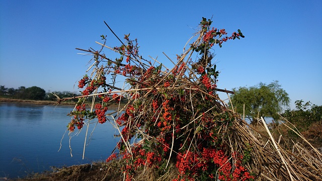 先週の台風の爪跡です。結構大きな木だったのですが、この木よりも上まで水が来たみたいで、、。絡みついたカヤがそれを物語っています。実も 流れが強かったであろう上の方は殆ど落ちています。でも川は、水量はまだ多いのですが 空を移した青色がとても綺麗です。空と川の色が同じなのも ちょっと不思議な感じでした。写真からは 音や臭い等は伝わってこないのですが、水が引いた後に残ってしまった”小魚”が何とも臭くて、、自然の凄さを改めて感じました。