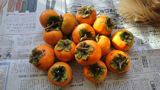 店に売っている柿と違って、一つ一つ個性があって、美味しさが未知の感じがして、何とも好きです。甘さ固さはどうだろうとか、種はどの位だろうとか、まさかの渋柿かもとか、いろんな事を想像しながら かぶり付きます。そう、柿をキュッキュッと拭いて、皮ごと かぶり付くのです。皮ごとかぶり付く私を小山はいつも黙って見ています。仲間になればいいのに、、。あっ、写真右上にシッポ発見。朝日の中で、柿も愛犬も気持ち良さそう。。