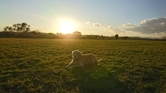 たっぷり川遊びをして、これから家に帰るところ。愛犬は、疲れ過ぎたのか、草が気持ちいいのか、風呂が嫌なのか、なかなかこの姿勢から動きません。気が付けば、日も落ちようとしているし、、。少し歩いて「帰るよ~」と振り向いて撮った写真が、この一枚。もしかして夕日が気持ちいいのかも。後ろ背中に日がたっぷり当たっています。よく見ると、愛犬、黄金色に輝いています。いい感じ。あっ、愛犬、ゴールデンでした。。
