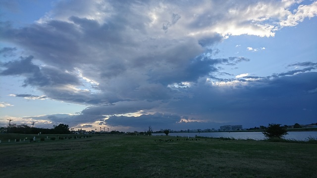 早朝の多摩川、京王多摩川あたりです。川鵜が集団で川横のグランドにいます。