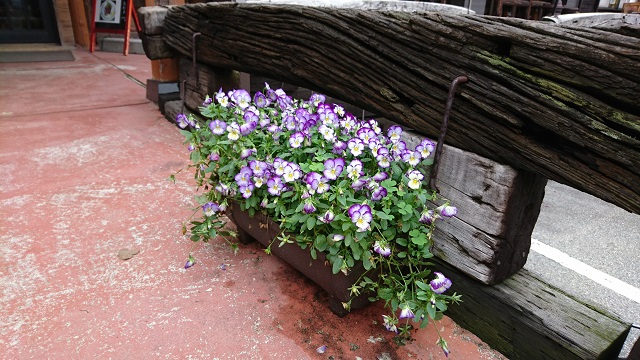 立ち寄ったお蕎麦屋さんの店先に置かれていました。ビオラです。