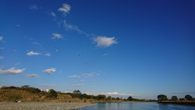 頭の上が「ピーヒョロロ、ピーヒョロロロ、、」と賑やかで、見上げると大きなトンビが飛んでいます。そして近くにはカラスもいます。2羽が空中でぶつかり合って、羽の音が聞こえてきそうな位凄い迫力で、川遊びしていた犬まで一緒に見上げる程です。実はこの光景はよく見かけます。縄張り争いのようで、周り情報によると、中洲の木にカラスが巣を作っていて 近づくトンビを追い払っているとか。この日凄かったのは、その後、トンビ×カラスが、4羽になった事。中継すると、トンビ×カラスが、1×1 → 2×1 → 2×2 に なって戦っていた事。大きさからして、多分どちらもご夫婦かと。協力しあって凄いなあ。。