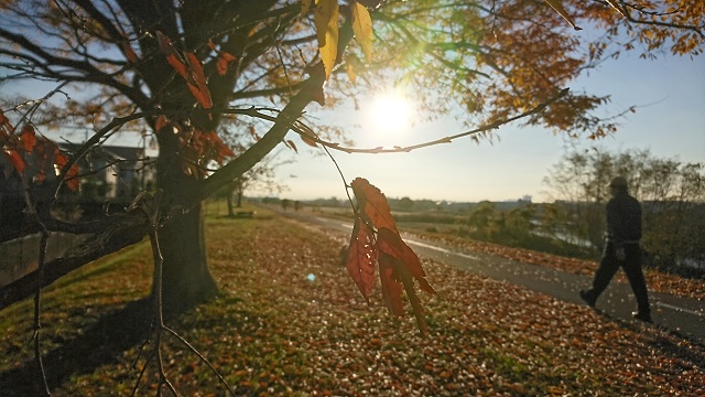 今朝の多摩川土手。木の下には枯葉がたくさん落ちていました。