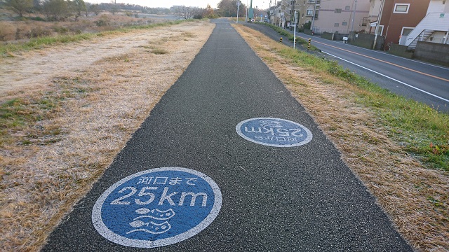 川向こう、川﨑側の多摩川の土手です。河口まで25㎞と書かれています。