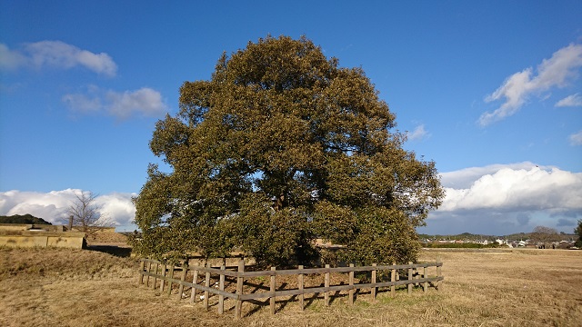 広い平地の中で、遠くから見て「大きいなあ」と思い、近づいて行ったら「大っきいなあ」と思い、柵の所では「スゴッ・・・」と思いました。大樹というのは、こういう木を言うのでしょうか。樹齢、何年位 経っているのでしょうか。百年、二百年、いや多分もっとかと。色んな時代を見てきたのだと思います。私達も見られているのかなあと思ったら 背筋が伸びました。にしても、いい形をしていますね。大きな剪定はしていないと思うのですが、どこも平等に陽が当たっていて、多少の雨風には動じない、どお~んと安心感があります。何となく、小山の顔が思い浮かびました。