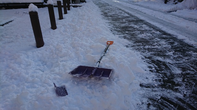 静岡生まれの私は、雪が降るとワクワクしてきて、かなり楽しくなります。この辺り、孫や犬と同じレベルなわけで、、そして、このワクワク感は、雪掻きへと向かいます。写真に写っている所、最初小山がやっていたのですが出掛けたので、残り全部やりました。近くに住む娘達の二軒の家の前もやってきました。頑張った。どんなに頑張ったかと言うと、まず、雪掻きのスコップが壊れました (写真参照) 。次に、娘がくれた少し飲みかけの1.5リットルのカルピスウォー○ー、全部飲み切りました。朝練以上の疲労感、達成感でした。で、何より、娘達から「有難う!週末何かお礼します!」の言葉がLINEに届きました。 お寿司がいいです。