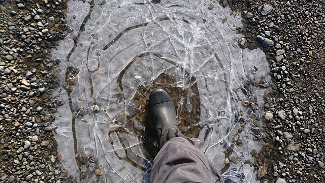 犬の散歩に行こうとしたら、道端の水溜まりが凍っていました。