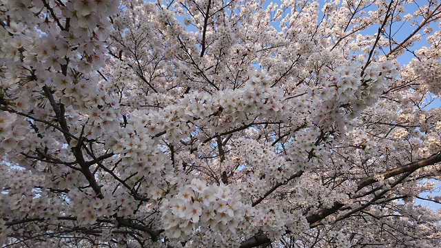 ギッシリ ビッシリと、どの枝も重そうに桜がいっぱいです。早朝だった為、あまり人も居ず、稲城大橋近くまで続く桜並木を満喫してきました。若い樹が多く 勢いがあるというか、空を隠してしまう位 窮屈そうに咲いています。すごいなあ。そして、夜は小山と夜桜を見てきました。と言っても、出掛けた帰りに少し遠回りをして、近くの桜並木を車の中から見たのですが、桜のトンネルがずっと続いて、これまた凄かったです。今年は、朝に夜に贅沢な花見でした。