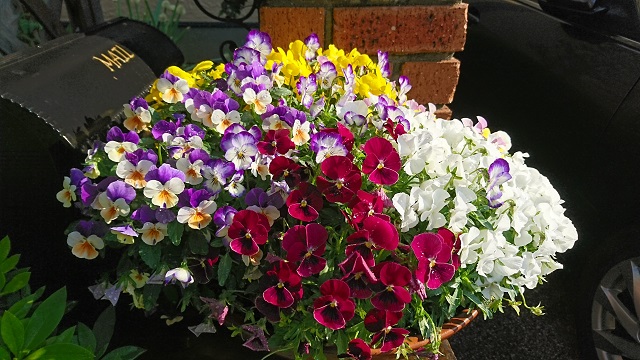 事務所入り口の所。大きな丸い鉢に、ビオラが溢れんばかりに咲いています。