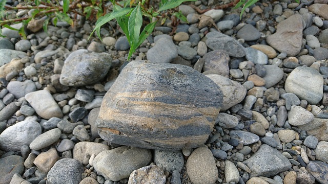 大きさは、握り拳1.5倍位。犬が川で泳いでいる間、私はよく石ころを見ています。いろんな大きさ、形、色、柄があって、飽きません。この日、気になったのはこの石。綺麗なシマシマが入っていて、地層が分かります。手に取ると、思っていたよりズシッと重い。石の硬さが伝わってきます。さて、地層です。このシマシマは、砂や泥等が層になって出来たもの。100年単位とかではなく、もっともっと長い年月を経て押し固められたもの。岩が割れて、ゴロゴロ転がって、丸みを帯びた石になって、、すごいなあ。この石の歴史を勝手に想像させて貰いました。日曜午後、曇り空から時折、陽が差して、ゆっくりとした時間が流れました。