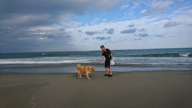 いつものように、ボール投げ。日が暮れるまで遊んできました。故郷の海は優しいです。
