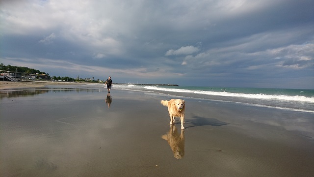 昨日、とんぼ返りで静岡に行ってきました。用事を済ませて海に行けたのは、夕方5時過ぎ。潮は満潮近くだったのか、砂浜の上の方にまで 波が打ち寄せていました。で、この写真。波が引いた後、犬が鏡のように、もう一匹。遠くの小山も、下にもう一人。雲まで写っています。すぐに薄くなって消えてしまいましたが、やっと撮った一枚がこれ。犬は影まで映って、賑やかな写真となりました。晴れていれば、正面に富士山が見えます。