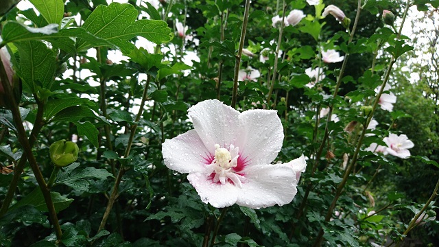 この花も夏を代表する花の一つかと思います。日差しの強い朝だったのですが、皆、下を向くことなく、空を見上げていました。調べれば、ムクゲは「一日花」とのこと。きっと、この花達、開いて時間が そんなに経っていない筈。だから、こんなに みずみずしく綺麗なのだと。ちなみに、ムクゲの花言葉は「信念」。どんな状況下でも咲く、という強い習性、思いを、持っている花。 好きです。