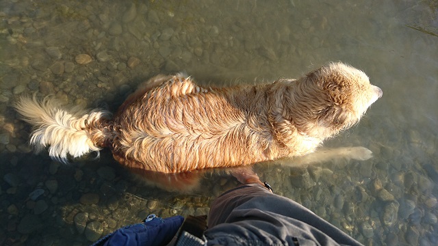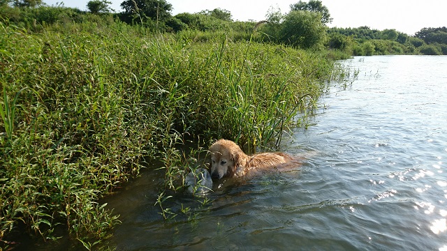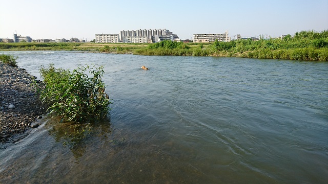さて、その中で事は起きたのですが、草たちの写真を撮っていて振り向いたら、犬が下流の方に流されています。どうやらボールを追いかけて流された模様。私も追いかけて、、