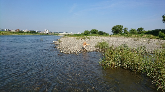 流されて、恐い思いをしたのか、今日の運動はもう十分と思ったのか、犬が来た道の方に帰っていきます。後ろ姿は疲れ切っていて、哀愁が漂っています。