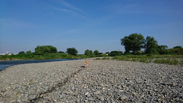 小山は、健康と肥満と肥満と肥満の為、早朝 walkingをしています。早足で一時間歩いてビッショリになった小山が、土手の上から迎えに来てくれました。感謝。