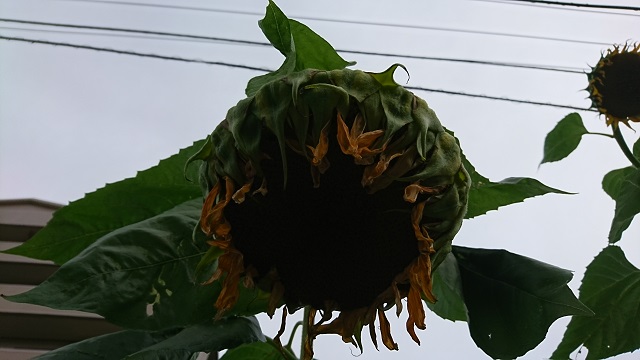 これは一週間後くらいの写真。一際大きかった花は、咲きっぷりも見事だったのですが、うな垂れっぷりも見事で、、。朝、自転車で走っていたら、花がお辞儀してくれているような錯覚をうけ、私も挨拶をさせて貰いました。今こうして写真を見ると、ヒマワリの側面というか裏側、芸術的ですね。下向きの花びらの均一性もいいのですが、額、いいですね。上に横に、力強さ 躍動感を感じます。