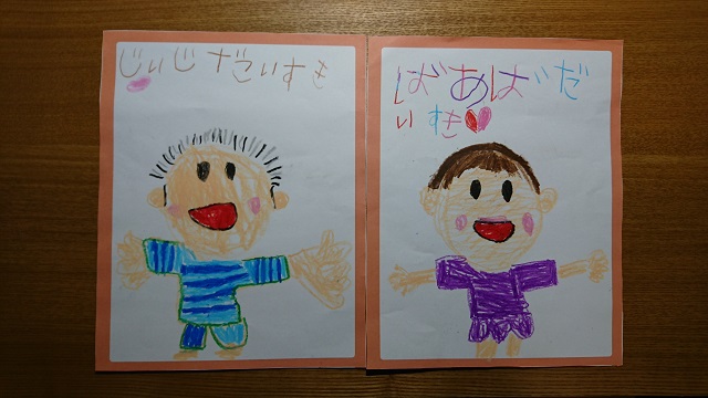 じいじ、ばあばの特徴を良く掴んでいます。じいじの髪の毛、黒と灰色で白髪具合をよく表してます。ばあばの髪の色もこんな感じ。じいじの手は大っきい。どちらも、両手をいっぱい広げてる。そして何より、二人共、笑顔。よかった。ひぃちゃん画伯、有難うね。最高です。