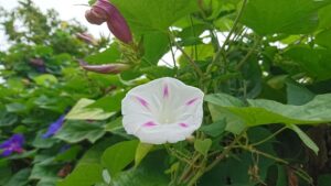 何度か登場しているノアサガオとヘチマの垣根に、一緒に咲いていました。 雨が今にも降り出しそうな今日の午後、垣根の一番高い所に咲いていました。思い切りつま先立ちして 肩関節グ~ンと伸ばして、撮った写真がこれ。白地に 遠慮っ […]