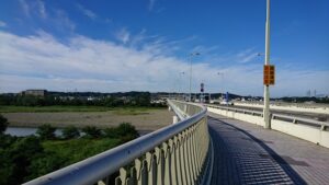 稲城大橋です。今朝は久々に橋を渡ってみました。写真は川﨑側への歩道部分で、右側に車道が広がります。 下は多摩川。正面左側は読売ランドです。以前にも稲城大橋を下からご紹介したことがあると思います。橋の右側の下辺りには、桑の […]